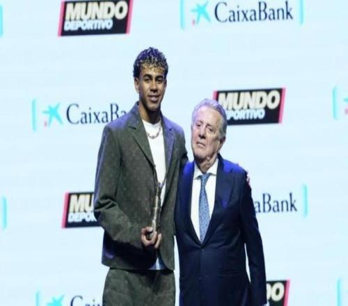 巴萨球星亚马尔在第78届《世界体育报》颁奖典礼上,从哈维尔-戈多手中接过了奖项,以表彰他在2025年的惊艳表现...