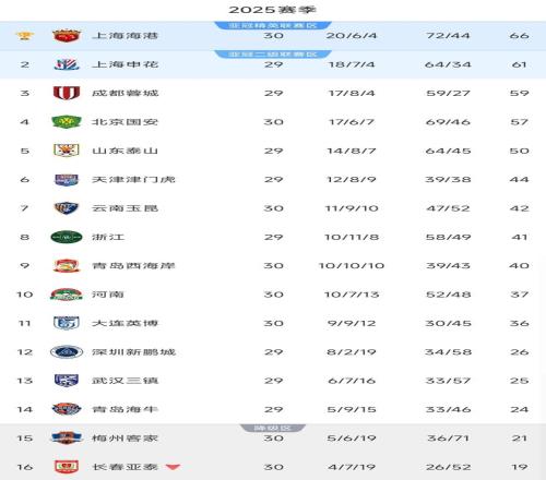 中超大结局:冠军上海海港,亚军上海申花,季军成都蓉城。降级球队:梅州客家、长春亚泰。