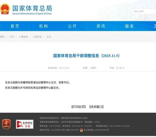 12月1日,国家体育总局在其官网公布了干部调整信息,任命王励勤为乒乓球羽毛球运动管理中心副主任。